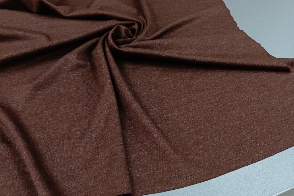 Итальянский трикотаж из вискозы коричневого цвета с метанитью. Приятный, мягкий не колючий, плотный, пластичный не просвечивает. Подойдет для пошива нарядного платья, кофты, топа, лонгслива, кардигана, юбки, шорт.
