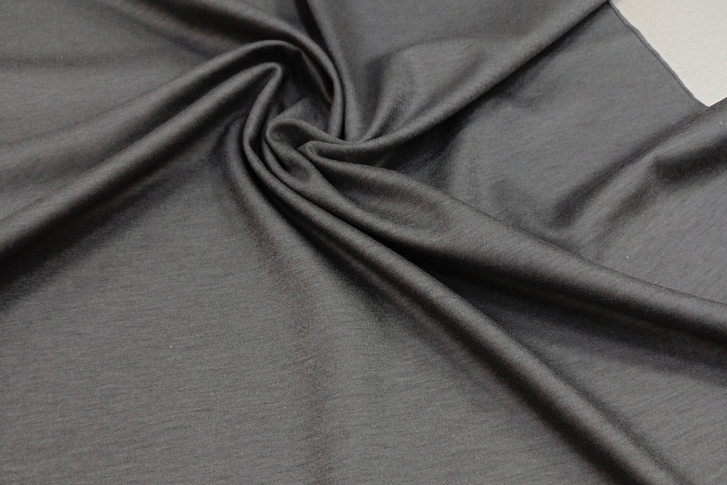 Итальянское черное джерси. Полотно эластичное, мягкое и приятное на ощупь ткань, которая хорошо тянется и не стесняет движений. Эта ткань хорошо держит форму, не пиллингуется и долго сохраняет свой первоначальный вид при должном уходе. Она пропускает воздух, впитывает влагу и быстро высыхает, что делает ее комфортной для ношения в любое время года. Из джерси шьют разнообразную одежду, такую как футболки, майки, свитера, платья, костюмы и даже верхнюю одежду.
